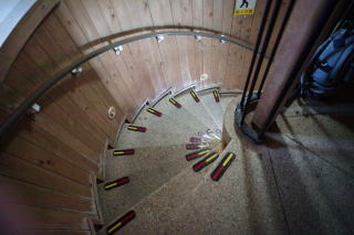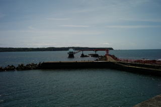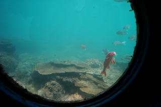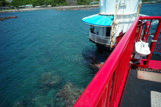 海中展望塔は海中に設置された壺のようなものに降りて行くのですが、それまでに鉄骨で作られた階段、遊歩道を歩くのです。遊歩道のところにはシートが掛けられてありましたが、もしシートがなければ金網から約10メートルくらい下の海が見えるのでとても歩けなかっただろうなと思います。シートがあったので、10分足らずで、壺の中に入ることが出来ました。