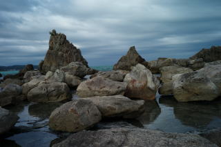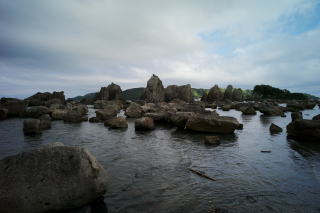潮岬灯台を出て、時計を見ると午後2時40分でした。昼食がお刺身定食でボリュームがなかったのでお腹がすいてきました。それにタクシーを呼ぶためにも大きな施設の公衆電話を探すことも必要です。それでMさんから教えてもらった南紀熊野ジオパークセンターと潮岬観光タワーに行くことにしました。10分程で到着してジオパークセンターの受付の人からレストランが午後3時までと言われて慌ててレストランに行ったのですが、閉店の表示が出ていました。私はとてもお腹が空いていたので、とにかく何かお腹が満たされるものを食べたい、橋杭岩に行けば観光スポットなので、たこ焼き、焼きそば、たい焼き、イカ焼きなどのお腹が満たされるものを食することができるのではないかと思いました。そこでタクシーを呼ぶことにしたのですが、串本タクシーの方が私のリクエストに応えてくださり、Mさんのタクシーに乗ることが出来ました。私が、こちらでは大阪の民放が聴けるのですかと尋ねるとMさんは、ここではNHKと和歌山放送しか入りません。三重県まで行くとCBCが聴けるので、つボイノリオさんの「聞けば聞くほど」を聴きますと言われました。私は今から20年前にその放送をよく聴いていたので、今でこそ落ち着いた放送になりましたが、その頃はあまりにエッチな放送だったので、お昼の深夜放送と言われていましたねと言うとMさんは頷きました。Mさんは橋杭岩で食事できるところと私から言われて干物屋さんの前で下ろして下さりましたが、その店は午後3時までで店の前まで行くと、もう食事はしてませんと言われました。おいしそうな干物が並べられていましたが、そのまま食べられないので、近くの土産物屋で空腹を満たすものを探しました。どちらかというとぽっちゃりタイプの私はお腹がすくといらいらして何もしたくなくなるのです。土産物屋で饅頭やクリームサンドを購入して食べても良かったのですが、それだと包装が大がかりなのでゴミがたくさんになるだろうと他の食べ物を探しました。そうして見つけたのが、さつま揚げを加工して棒をさしたさつま揚げスティック(そう言うのかわかりませんが)でした。エビマヨ入りとタコ入りの2本を買って、店の前のベンチでそれを食してから、橋杭岩の撮影に取り掛かりました。Mさんは串本の最高の観光スポットと言われるだけあって、観光客もたくさん来られていましたが、1時間すると急に空が暗くなってきました。そんなこともあって私は午後4時30分には撮影を止めて、市街地の方へと歩き始めました。Mさんから勧められたお店、萬口(マンコウ)に行くためでした(ここのカツオ茶漬けがおいしいと言われました)。