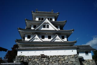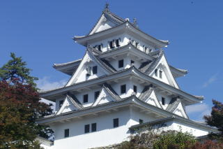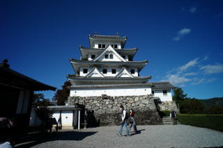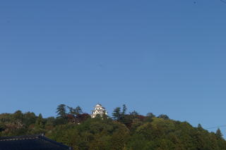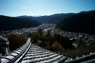 お腹が一杯というほどは食べなかったのですが、腹ごしらえができたので郡上八幡城の天守閣を目指すことにしました。城下町プラザ近辺を歩いていると天守閣がちらちら見えて私は何枚か望遠レンズ(ライカ 沈胴式エルマー90ミリ)で写したのですが、2006年に設置された山内一豊と妻の像の背景に入れるのがベストではないかと思います。