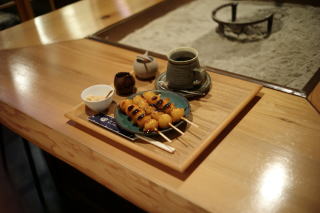 お城の見学が終わった後は、郡上八幡のソウルフード?と言われる、鶏ちゃん焼きと醤油フランクを郡上八幡旧庁舎記念館で食べました。ここには明宝ハムのステーキ定食(1100円)と味噌煮込みうどん(1000円)もあり美味しそうだったのですが、食べ過ぎて歩けなくなると困るので我慢しました。土産物売り場で食品サンプルのキーホルダーやマグネット(たこぶつ、みたらし団子、イクラの軍艦巻き 郡上八幡は食品サンプルの街と言われさんぷる工房という施設もあります)を購入しましたが、吉田川にかかる新橋の近くの中古カメラ屋さんが目に入り、奥さんの促されるままに店内に入りました。しばらくして年配のご主人が出て来られ20分ばかりカメラの話をしていましたが、レンズばかりぎっしり詰められたウインドケースの中に、オリンパスOMシリーズ用のズームレンズがあるのに気付きました。私は今から47年前にオリンパスOM1を購入して、ライカを購入するまでの23年間は愛用者で、24、28、200、50マクロなどのズイコーレンズを購入したものでしたが、ズームレンズは高額で購入できませんでいました。ところがこの売値が15,000円だったので思わず購入してしまいました。(距離計は使えませんが、アダプターでMマウントのライカと繋げられるのでいろいろ試してみたいと思いました)そんな散策も午後5時頃になると人が少なくなり私も小腹が減って来たので、とりあえずみたらし団子を食べて電車に乗る前にラーメンを食べることにしました。どちらも新町通りにある店ですがさんぷる工房に行くのを我慢して、私は団子茶屋に入りました。炭火焼きの香ばしいみたらし団子は美味しかったですし、ホットコーヒーとの相性もばっちりでした。