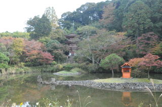 紅葉のシーズンであれば三重塔も際立ったかもしれませんが、どちらかというと地味で小さな建造物でしかも手前の樹木の枝が三重塔を取り囲む(文学的に言うと抱きしめるでしょうか)ますます撮影しにくい被写体になっていました。そのあと池の向かい側に行き、近くで三重塔を写して阿弥陀堂を見ました。あれほどの貴重な仏像がたくさん安置されているのに阿弥陀堂も地味な建物で撮影するのを躊躇しましたが一応撮影しました。