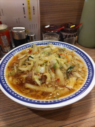 「彩華ラーメンは白菜、豚肉、ニラ、ニンジンを煮込んだスープが美味しいんです。ぼくは最初キムチを煮込んでいるのかなと思ったのですが、どちらかというと白菜と豚肉の鷹の爪入り甘煮という感じのスープが細麺にピッタリという感じのラーメンです」