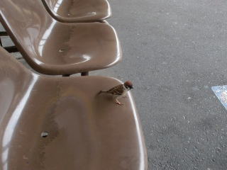 店を出るとすぐに寄り道せずに八幡駅に入りましたが、次の電車まで20分程ありました。駅舎の中に美味しそうな弁当を販売しているコーナーがありましたが、八幡チャンポンを食べたところなのでそこを通り過ぎホームで電車を待ちました。ホームで待っているとすずめがやって来て、こちらを見上げました。そのすずめが隣のベンチでじっとしていたので、そっと鞄からカメラを取り出して撮影しました。以前からすずめを撮りたいと思っていたので、これだけで八幡までやって来た甲斐があったと思いました。
