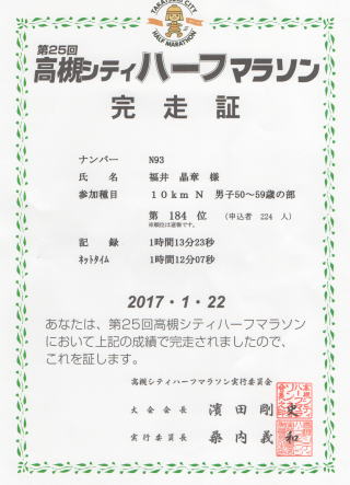 そういうわけで、初めての高槻シティハーフマラスンはそれなりの成果があったと思っています。2、3年この大会の10キロかハーフマラソンに出て、余裕が出来たら、他の場所で開催される大会に出ようと思います。そのためには20キロを走り続けられる体力をつけないと駄目だと思います。まずは、月に1度くらいひらパー(枚方パーク)まで足をのばして20キロを走るようにしようと思っています。