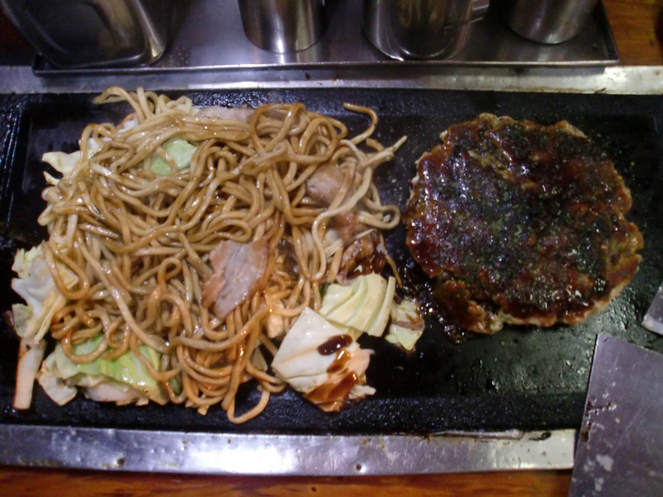 ぼく、たこちゃん。美味しい食べ物に目がない50代のおじさんなんだ。ぼくは、中古レコードを収集するのが趣味なんだけど、今から15〜20年前は阪急東通り商店街にある名曲堂とスマイル・レコーズ、堂山にあるDiskJJ、太融寺の近くにあるストレイト・レコードにはよく行った。主にクラシック音楽のレコードを購入したが、DiskJJやスマイル・レコードではジャズの貴重なレコードもたくさん購入できた。その前は京都や神戸元町のクラシック専門の中古レコード店に通い詰めたけど、初心者だったのでどのレコードが安くて価値があるのかわからず、たいして値打ちのないレコードに1万円以上使ったこともあった。最近は東京新宿のディスク・ユニオンでレコードを購入することが多くなったが、たまにDiskJJの後にできた、大阪のディスク・ユニオンに行く。前置きが長くなってしまったが、ぼくは阪急東通り商店街を通る時にいつも気になってたお店があって、それがお好み焼き店美船なんだ。後に有名店であることを知り、いつか行ってみたいと思っていた。初めて店の前を通った時、いかにも昭和の頃にできた店だなと思ったものだった(昭和23年創業らしい)。午後0時40分頃に店に入ると一人用の席が空いていてそこに案内された。メニューを見て、豚焼(900円)と焼きそば大盛(1,200円)を頼んだ。この店は基本的にお好み焼きは自分で焼くことになっているようで、おばさんが具材が入った金属のお椀を持って来てあとは自分でやってくださいという感じだったので、ぼくは、きれいなお好み焼きを撮りたいので焼いてくださいと頼んだ。それでおばさんはお好み焼きを焼きながら、(具材を)全部鉄板に乗せてから4分は返さないでくださいとか、3、4回返してから1分程待ってから食べてくださいと説明してくれた。やきそばは別のところでご主人が調理して、鉄板に乗せられた。ソースは同じだと思うが、甘めのとんかつソースだった。焼きそばもお好み焼きもとても美味しかったが、特に焼きそばはかなり太めの麺に豚肉、イカ、キャベツがたっぷり混ぜられていて最後まで美味しく食べた。