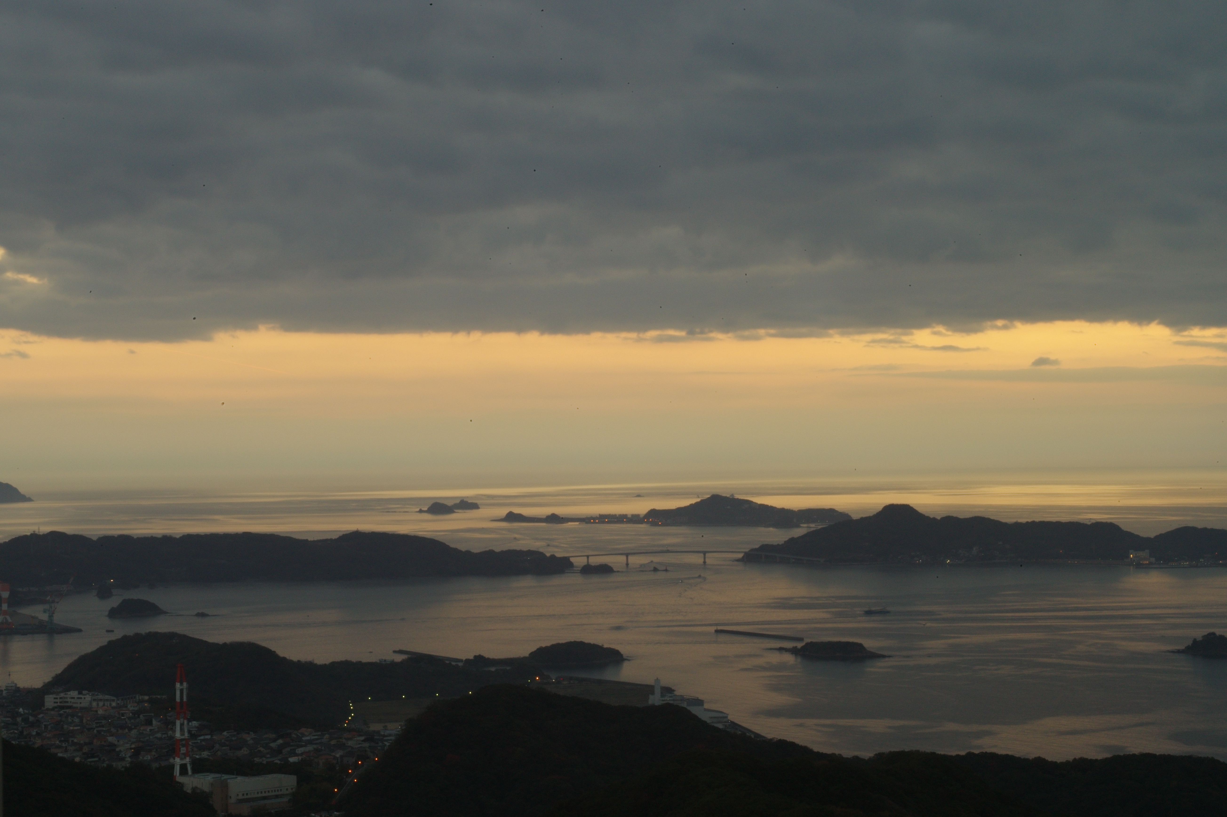大浦天主堂とグラバー園を訪問してから、タクシーで稲佐山へと向かいました。地図で見ると長崎駅から稲佐山のロープウェイ乗り場までは近いように思いましたが、タクシーの運転手さんに尋ねると歩くのは大変のようでした。それで運転手さんが言われるように、帰りは稲佐山山頂にタクシーで行かれる方がいるので、そのタクシーが帰るところを捕らえることにしました。それでもロープウェイの往復乗車券を購入して午後5時前のロープウェイに乗りました。すぐに展望台に上り、明るいうちにカメラに三脚を取り付け夜景撮影の準備をしました。午後5時半を過ぎると夕焼けの中にぽつりぽつりと電灯がともり始めました。