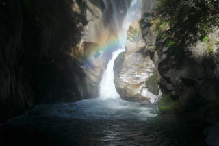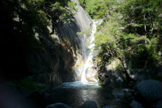 昇仙峡へと向かう山梨交通のバスに遅れが出て、少し焦りました。幹線道路で衝突事故があり、現場検証で流れが悪くなっているようでした。20分遅れで目的地に到着したので、早速カメラを取り出して、仙娥滝に向かいました。観光地によくある食べ物屋や土産物屋を通り抜け坂道を降りると奥まったところに仙娥滝が見えましたが、水量が豊富で緑が綺麗でした。さらにいつもそうなのかわかりませんが、滝壺から1メートルほどのところにくっきりと虹が見えていて少し暗いところで妖艶な光を放っていました。